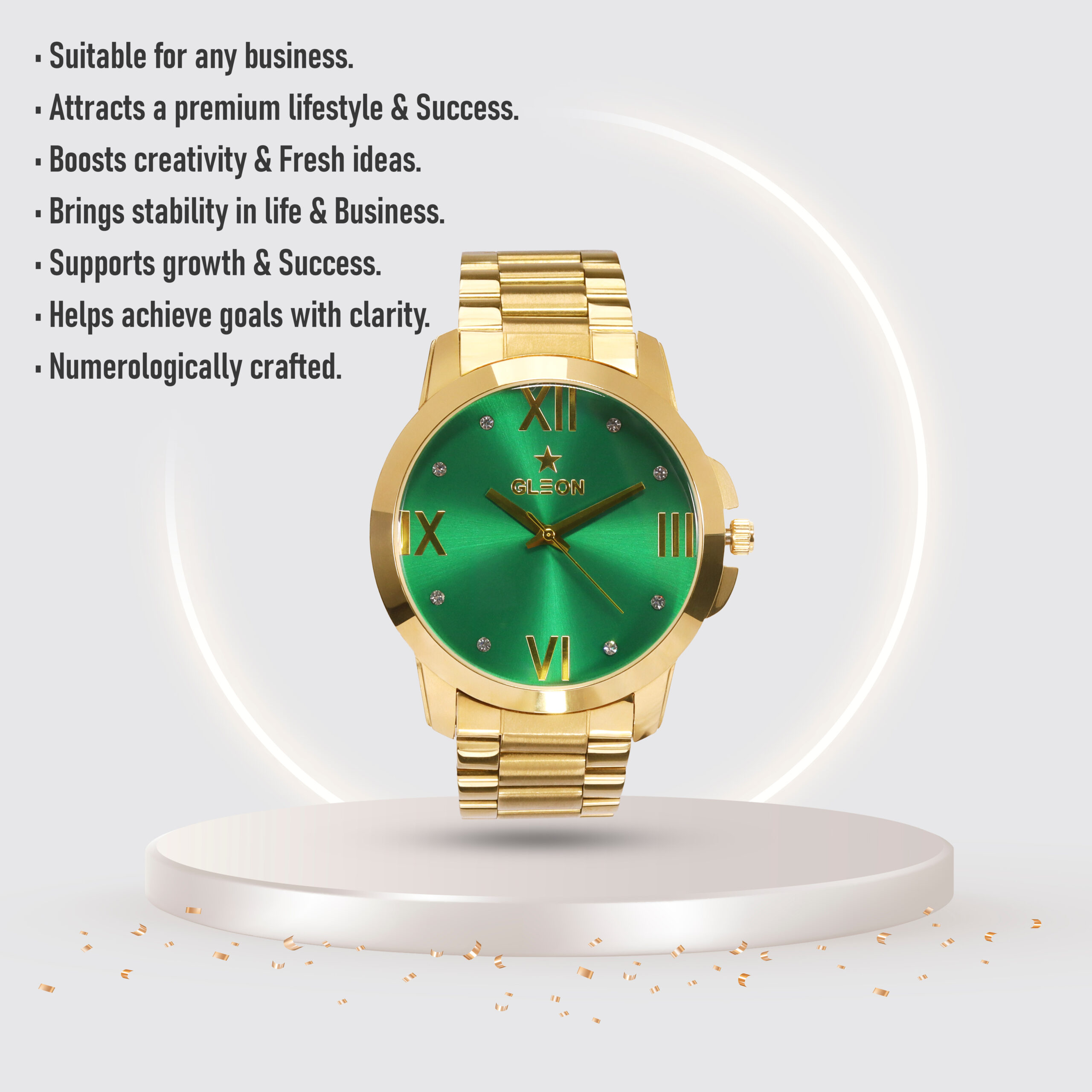 The GLEON WATCH is a luxury numerology timepiece powered by precision Japanese movement. Featuring a striking green dial and gold stainless-steel design, it represents ambition, clarity, and personal growth. Crafted for those who value both spiritual alignment and refined craftsmanship, the GLEON WATCH is more than a watch—it’s a bold statement of success and purpose.